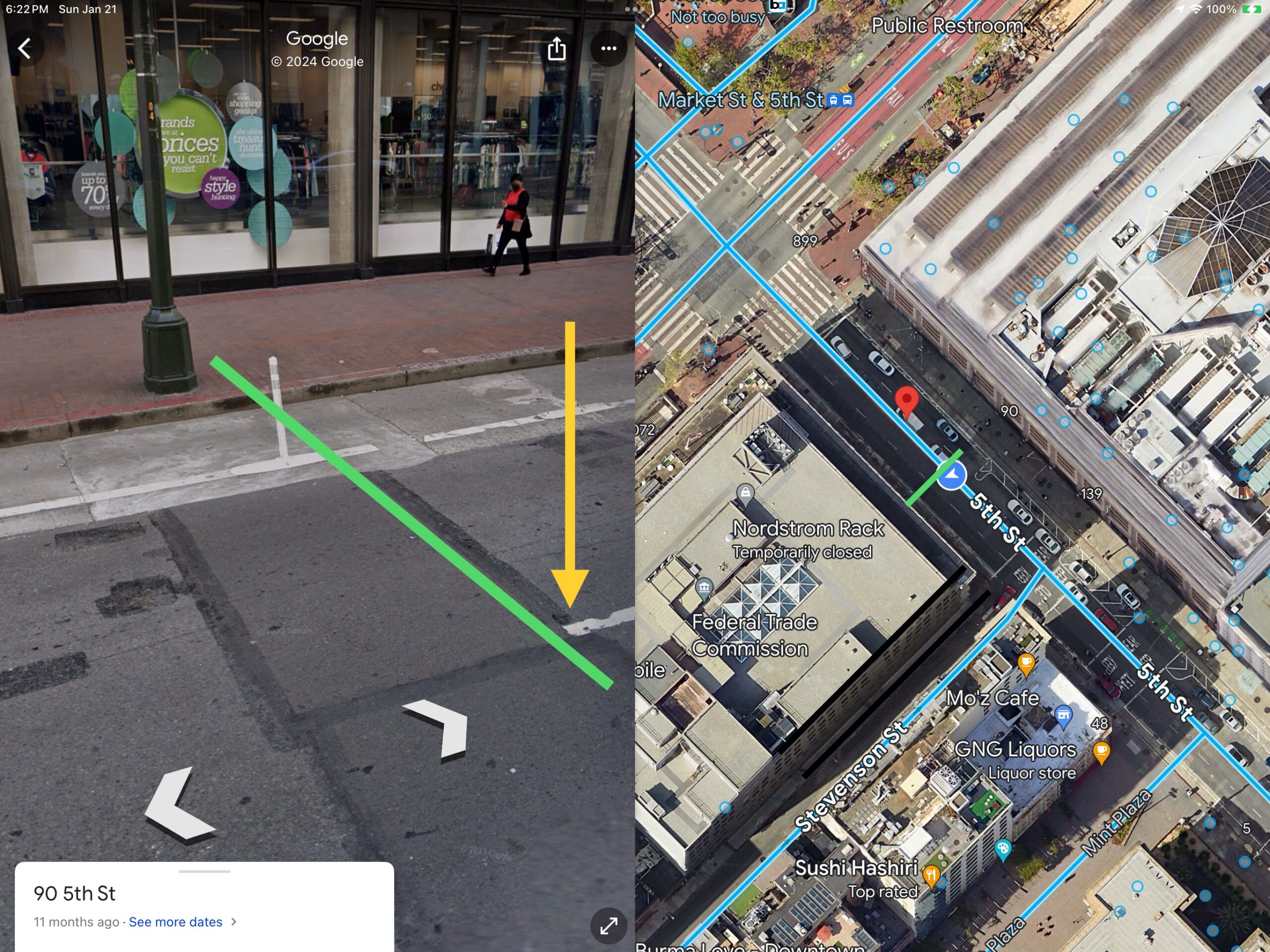 The first obvious issue is that the vehicle came to a stop quite far away from the crosswalk. Key question is how did the pedestrian travel so far given that Cruise claims the initial impact when pedestrian was in the crosswalk was severe and the pedestrian was launched in front of the AV? Something is not right. All sources agree that the pedestrian was initially hit while in the crosswalk so that part is not in dispute.